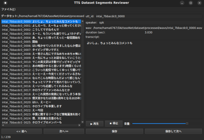 ここまで見たらわかるようにところどころデータにおかしいところがあります。データセットの質はモデルの質にクリティカルに効いてくるので、全て手動で精査します。これも専用のGUIツールを作って行います。