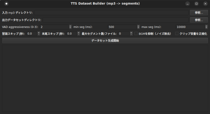 その後データを10秒前後に再整形し、無音などの抽出を実施します。ここはPythonの音声編集ライブラリを使いました。一つアドバイスですがこういう試行錯誤を繰り返す系の処理はGUIを準備してしまうのが便利です。よっぽど出ない限りCUIとGUIでは操作性と情報量に差がありすぎます。