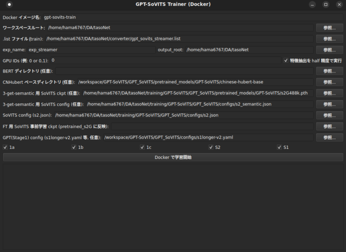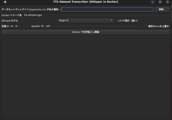 前プロセスで処理した音声ですが、このままだと音声だけです。学習に使うためには実際に何を喋ったかのテキストファイルが必要です。ここは結構コケるかなと思ったのですが、現代のAIは凄くて綺麗なデータセットを用意すれば結構ちゃんと文字起こししてくれます。たそネットではOpenAIのWhisperを使っていますが、ML関連ライブラリ周りの依存がだるかったのでGUIからDockerコンテナを実行していく形で実装しています。