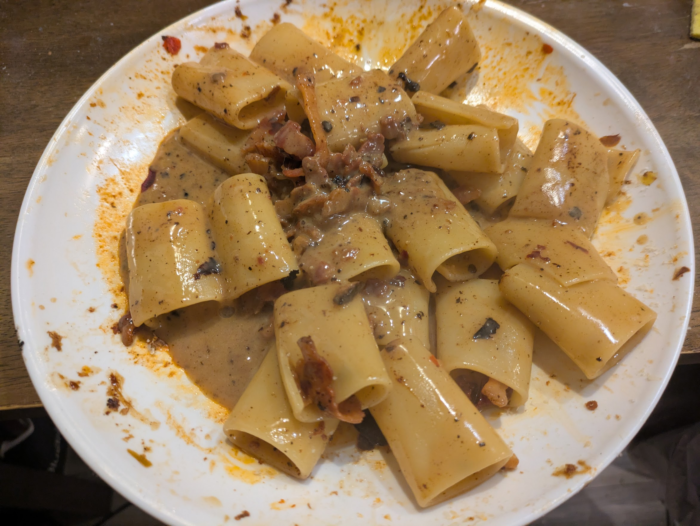 そもそもカルボナーラ自体テクい料理なので基本的な部分ができるようになった後素材の差が出てきて、そうなると旨味の深さがグアンチャーレとパンチェッタでは違い過ぎる。パンチェッタの場合は乾燥キノコとか少し旨味になるものを足した方が良い。